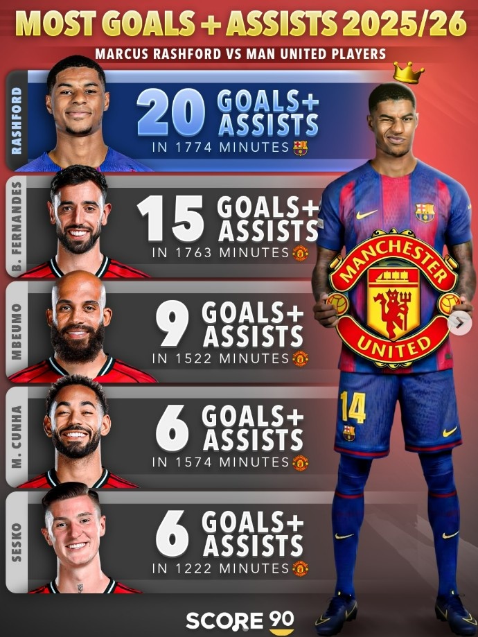 想他吗?拉什福德本赛季直接参与20球,比曼联一众攻击手都要多